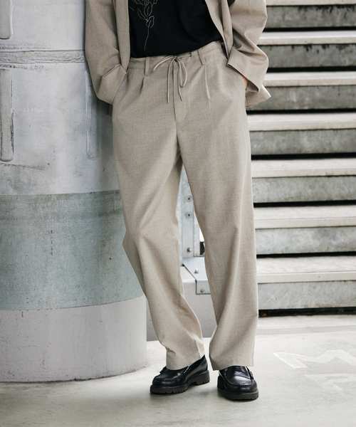 TR SLUB TORO EASY SLACKS 先染めのTR平素材を使用した、汎用性の高いイージースラックス。 スラブ糸を用いたポリエステル×TR混素材は、MIX感のある天然ライクな表情と、ほどよいシャリ感による肌離れの良さが特徴。さらにTR由来の柔らかさを加えることで、硬くなりすぎない、バランスの取れた風合いに仕上げています。 シルエットは「太すぎず、細すぎず」を意識した新型スラックス。腰まわりにはタックを入れ、ウエストは調整可能なウエストコード付きのイージー仕様にすることで、リラックス感ときちんと感を両立しています。 同素材のカーディガンやフィールドジャケットとのセットアップはもちろん、単品でもカジュアルからきれいめまで幅広いスタイリングに対応する、非常に使い勝手の良い一本です。 ********************** 裏地:なし 伸縮性:なし 光沢感:ややあり 生地の厚さ:薄め ********************** ※取り扱いについては、商品についている取扱表示にてご確認下さい。 ※照明の関係により、実際よりも色味が違って見える場合があります。 またパソコン・スマートフォンなどの環境により、若干製品と画像のカラーが異なる場合もございます。 ※商品の色味は、商品アップ画像をご参照ください。 本体:手洗い可能