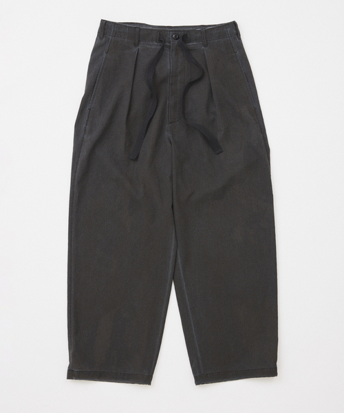 RIRANCHA PIGMENT OVER PT麻調素材「EVALET(エバレット)」にピグメント加工を施し、さらに洗いをかけることで、独特のシボ感とフェード感を表現した新素材を使用したオーバーパンツ。ドライで清涼感のある風合いに、顔料染めならではのムラ感と奥行きのある表情が加わり、シンプルながら存在感のある仕上がりになっています。見た目はリネンライクでありながら、ポリエステル素材ならではの扱いやすさと速乾性も兼ね備えた、春夏に最適な素材感です。シルエットはリラックス感のあるワイドシルエット。裾にはドローコードを配し、絞ることでシルエットの変化も楽しめる仕様に。スニーカーからサンダルまで、合わせる足元を選ばず幅広いスタイリングに対応します。《EVALET / エバレット》東レが開発した、優れた吸水性を持つ肌触りが快適な吸汗・速乾素材。ポリエステル素材のため、水切れが良く、室内外を問わず素早く乾きます。《RIRANCHA / リランチェ》TORAY開発のリネン調のポリエステル素材。上品でナチュラルな表情ながらも、夏でも着易いドライタッチの清涼感が特徴です。肌離れのしやすさやストレッチ性もあり、着心地にも配慮された素材。ポリエステル素材の為、麻のように見えつつもイージーケアになります。**********************裏地:なし伸縮性:なし光沢感:なし生地の厚さ:普通**********************※取り扱いについては、商品についている品質表示でご確認ください。※照明の関係により、実際よりも色味が違って見える場合があります。またパソコン・スマートフォンなどの環境により、若干製品と画像のカラーが異なる場合もございます。※商品の色味は、商品アップ画像をご参照ください。