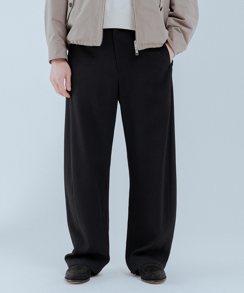 《ウール見え素材で仕立てる、都会的で美しい3Dシルエットパンツ》・ポリエステルながら色の奥行きとメランジ感を出し、繊細なウール見えを実現・柔らかくドライな肌触りとストレッチ性を備え、程よいハリ感で快適な着用感・脇線を前に振った独自立体パターンで、どの角度から見ても美しい3Dシルエット・ミニマルで構築的なデザイン、スラックスのようなクリーンな表情でカジュアルからきれいめまで対応【ご注意】※照明の関係により、実際よりも色味が違って見える場合があります。またパソコン・スマートフォンなどの環境により、若干製品と画像のカラーが異なる場合もございます。※商品の色味は、商品アップ画像をご参照ください。