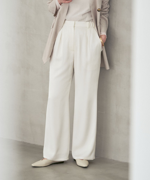 ◆NOBLEの名品ボトムス「ルナサテン」素材の新作パンツから新色が登場!※商品番号26030240101010の追加商品です。色違いはこちらの品番で販売中です。※若干の仕様変更がある場合がございます。※レビュー、SNAPには現在お取り扱いのないカラーも含まれます。予めご了承ください。控えめな光沢が美しいダブルサテン素材ながらご自宅でのケアが可能な人気素材「ルナサテン」シリーズから今シーズンNEW型が登場しています。今シーズンの新作は、タック入り且つ膝あたりまですっきりとしたナローフレアのデザインに。従来のルナサテンパンツでは脇線がなかったのに対し、ナローフレアの美しいシルエットをだすために今回は脇線を入れ形を表現。後ろのみゴム仕様なのはそのままに快適な着心地と美脚に導くキレイめなスタイルを両立。裾に向かってきれいなフレアラインが特徴の大人パンツに仕上がっています。デイリースタイルに欠かせない1枚になること間違いなしな優秀パンツは、今回新たにおつくりした同素材のロングキャミソールとのセットアップでの着こなしもお勧め。普段の雰囲気を変えて新鮮な着こなしが楽しめます。●シリーズのご案内ルナサテンレースアシンメトリーキャミ(商品番号:26051240111010)●型・カラー違いはこちらルナサテンナローフレアタックパンツ(商品番号:26030240101010)ルナサテンドレープシャツ(商品番号:26050240102010)**********************透け感:なし(ブラック)・あり(ホワイト)裏地:ホワイトのみあり伸縮性:なし光沢感:あり生地の厚さ:普通**********************【スタッフ着用コメント】年齢20代/身長:155cm/体型:やや細身/普段サイズ: 34~36 /着用サイズ:36サイズ感:身体から離れるゆったりとしたサイジング。フロントにタックが入っているので、太ももまわりのラインを拾いにくいです。着丈は長く足首が隠れる長さ。4~5cmのヒールやソールのあるシューズと合わせて穿くのがおすすめ。素材感:スムースでとろみのあるサテン素材。着心地:軽くて穿きやすいです。フレアシルエットなので、脚長効果をアップしてくれます。**********************※取り扱いについては、商品についている品質表示でご確認ください。※こちらの商品は、NOBLEでの取り扱いになります。直接店舗へお問い合わせの際はNOBLE店舗へお願い致します。※照明の関係により、実際よりも色味が違って見える場合があります。またパソコン・スマートフォンなどの環境により、若干製品と画像のカラーが異なる場合もございます。※商品の色味は、商品アップ画像をご参照ください。ブラック着用スタッフ身長:160cm 着用サイズ:38ホワイト着用スタッフ身長:164cm 着用サイズ:36モデルサイズ:身長:163cm 着用サイズ:38本体:手洗い可能
