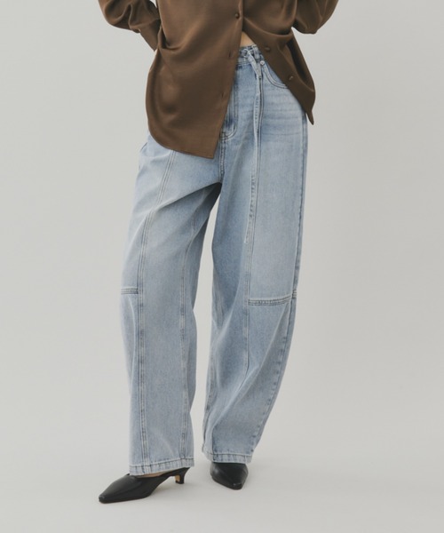 〈 Design Point 〉さりげない切り替えデザインが、柔らかな表情を添えるバレルデニムパンツ。膝下あたりに切り替えのデザインを施し、裾へ向かって緩やかにすぼまるシルエットを採用。女性らしく抜け感のあるバランスに仕上げました。同生地で仕立てた華奢なベルトが、ヴィンテージライクなアクセントに。ウエストまわりを自然に引き締め、トップスインのスタイリングも上品に決まります。実用的なポケット付きで、デイリー使いにも嬉しい仕様。柔らかなデニム素材を使用し、身体になじむ優しい穿き心地を実現しました。日常のコーディネートにさりげなく溶け込む一本です。〈 Styling 〉ニットやTシャツなど、コンパクトなトップスを合わせたスタイリングがおすすめ。ジャケットを合わせた大人カジュアルな着こなしも◎〈 Size 〉FREE サイズ〈 Detail 〉コットン100%透け感:なし伸縮性:なし裏地:なしケア方法:ご自宅でお洗濯可能です。ネットに入れてドライ(おしゃれ着洗い)にてお洗濯ください。※この製品は、独自の風合いを出すために洗い加工をしておりますので取り扱いの際には十分にご注意ください※デニム素材の特色として、選択の回数が増えるにつれて独特の持ち味(色あせ)が出てきます※アイロンがけの際は当て布をご使用ください。※濃色品は多少色落ちする可能性がありますのでお洗濯のさいは、淡色のものとは別にお洗い下さい。※濃色品は漂白剤入り、または漂白剤成分のある洗剤の使用はお控えください。※照明の関係により、実際よりも色味が違って見える場合がございます。※商品に付いている商品表示とアテンションタグをご確認の上、着用・お取り扱い下さい。〈 FUULLY STUDIO 〉 -フーリィースタジオ-「そぎ落としたクラシックをベースにフェミニンさとユーモアさの遊び心あるアクセントを加えた洋服で、あなたを満たす一枚」をテーマに、キュートで愛おしさを表現する柄やカラー、シルエットを落とし込んだ洋服を提案するレディースブランド。クラシカルでベーシックなアイテムとフェミニンなアイテムを融合させたスタイリングで、凛とした女性の中の愛おしさを表現しています。〈 公式Instagram 〉@FUULLY_STUDIO新作アイテムの情報やおすすめ商品を随時UPしております。是非チェックしてみて下さい。----------------------------------------------------〈 お買い物をよりお楽しみいただく為に 〉・商品のお気に入り登録♡をクリックして気になるアイテムをお気に入りに登録していただくと完売カラーの再入荷や、ラスト1点の通知、セールの際の通知を受ける事ができます。ブランドのお気に入り登録もご一緒にお願い致します。