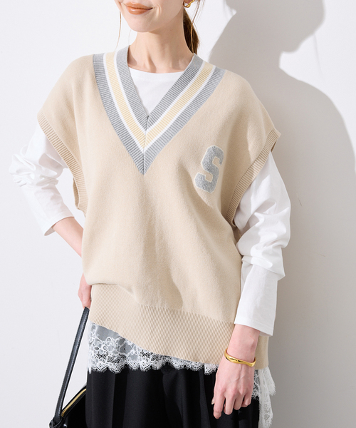 洗濯機使用可能 【2026SS】 SLOBE IENA POINT ・ソフトタッチのコットンをダブルフェイスに編んだ素材を使用。 【素材の特徴】 洗濯機使用可能で軽やかな素材。 【デザイン】 胸元にはサガラ刺繍でワンポイントロゴを配置。 レイヤードしても程よく体離れするシルエットが特徴です。 トラッドテイストの着こなしをお楽しみいただけます。 【コーディネート】 シャツやカットソーのレイヤードがおすすめ。 やわらかいカラーの配色で顔写りも華やかに見えるベストです。 ********************** 透け感:なし 裏地:なし 伸縮性:あり 光沢感:なし 生地の厚さ:普通 ********************** 《スタッフ名:Sally》 年齢:30代後半/身長:162cm/体型:細身/普段サイズ:M/着用サイズ:フリー サイズ感:ヒップが隠れる着丈。身幅は程よくゆとりがあるのできゅうくつ感はなく着れました。 素材感: 肌当たりの良い柔らかさのあるニット素材。 着心地:伸縮性もあって楽に着れました。 ********************** ※取り扱いについては、商品についている品質表示でご確認ください。 こちらの商品は、SLOBE IENAでの取り扱いになります。 直接店舗へお問い合わせの際はSLOBE IENA店舗へお願い致します。 ※照明の関係により、実際よりも色味が違って見える場合があります。 またパソコン・スマートフォンなどの環境により、若干製品と画像のカラーが異なる場合もございます。 予めご了承ください。 ※商品の色味は、商品アップ画像をご参照ください。 本体:洗濯機洗い(弱)