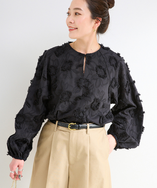 コットンの立体感のある刺繍レースが華やかなチュニック丈ブラウス。 フラワー刺繍を施した3Dレース生地を使用し、キレイめなボトム合わせでも十分に着映えするアイテムになっています。内側に付いた隠し釦を開けてキーネック風にも着られ、ボリュームを持たせた袖の膨らみが可愛らしいチュニックです。手洗い可能でご自宅でのイージーケアができるのも嬉しいポイントです!**********************透け感:全色やや透け感あり裏地:なし伸縮性:なし光沢感:なし生地の厚さ:普通**********************【スタッフ着用コメント】《スタッフ staff.K》身長:162cm/普段サイズ:S-M/着用サイズ:フリーサイズ感:首元はクルーネックですっきり、全体的にゆったりシルエットです。素材感:立体感のあるレース生地でほどよく厚みがあり、温かみのある素材感です。着心地:存在感があり華やかな印象。着映えするのでボトムはシンプルな合わせでもサマになります。胸元の開き具合も浅めなのでインナー見えする心配なく着られます。※あくまで個人の感想です。**********************※取り扱いについては、商品についている品質表示でご確認ください。・形を整えて干してください。洗濯により収縮やねじれ。型崩れすることがあります。・着用中の摩擦や、汗、水濡れにご注意ください。濡れたままの状態で擦れると、色移りすることがあります。※こちらの商品は、B.C STOCKでの取り扱いになります。 直接店舗へお問い合わせの際はB.C STOCK店舗へお願い致します。※照明の関係により、実際よりも色味が違って見える場合があります。またパソコン・スマートフォンなどの環境により、若干製品と画像のカラーが異なる場合もございます。※商品の色味は、商品アップ画像をご参照ください。 ブラック、ホワイト着用スタッフ:157cm 着用サイズ:フリーサックスブルー着用スタッフ:163cm 着用サイズ:フリー詳細着用モデル:163cm 着用サイズ:フリー本体:手洗い可能