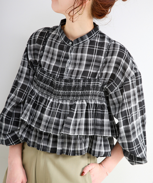 フリルキャミソールとセットになったキャッチー感のあるフェミニンブラウス。新色のブラックA(002)とブルー(044)カラーを加えて登場。※こちらは《品番:25051700818010、25051700610030》の追加商品です。・同一商品でも個体差が生じるため、採寸内容に若干の差が生じる場合がございます。柔らかなコットンボイル素材を使用し、キャミソール前端に同色刺繍を施した前後2WAYで着用可能なフリルキャミソールをレイヤードさせたセットアイテム。ウエストシェイプしたシルエットのブラウスはスタンドカラーでシンプルなディテールにし、セット着でも甘すぎないテイストにしており単品でも着回しができます。フリルキャミソールはTシャツやカットソーとレイヤードしてもおすすめです。ネットに入れ、洗濯機洗い(弱)可能で気軽にお手入れできるのも嬉しいポイント。**********************透け感:全色やや透け感あり裏地:なし伸縮性:なし光沢感:なし生地の厚さ:薄手**********************【スタッフ着用コメント】《スタッフ staff.K》身長:162cm/普段サイズ:S-M/着用サイズ:フリーサイズ感:程よくゆとりのあるサイズ感。キャミソールは肩紐アジャスター仕様、身幅はリボンで調節可能。素材感:薄手のコットンボイル素材。着心地:素材感柔らかく、スタンドカラーのブラウスもキャミソールもほどよくゆとりがあり着やすいです。※あくまで個人の感想です。**********************※取り扱いについては、商品についている品質表示でご確認ください。・形を整えて干してください。洗濯により収縮やねじれ。型崩れすることがあります。・着用中の摩擦や、汗、水濡れにご注意ください。濡れたままの状態で擦れると、色移りすることがあります。※こちらの商品は、B.C STOCKでの取り扱いになります。 直接店舗へお問い合わせの際はB.C STOCK店舗へお願い致します。※照明の関係により、実際よりも色味が違って見える場合があります。またパソコン・スマートフォンなどの環境により、若干製品と画像のカラーが異なる場合もございます。※商品の色味は、商品アップ画像をご参照ください。ブラック、カーキ着用スタッフ:157cm 着用サイズ:フリーブラックA、ホワイト、ブルー着用スタッフ:163cm 着用サイズ:フリー詳細着用モデル:163cm 着用サイズ:フリー本体:洗濯機洗い(弱), キャミソール:洗濯機洗い(弱)