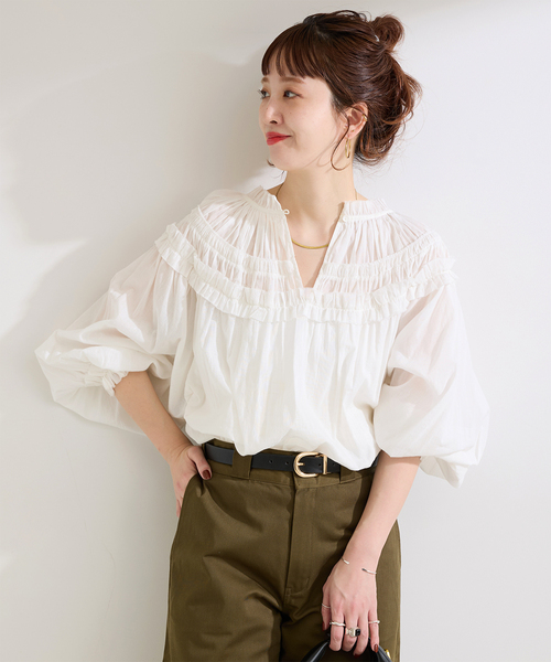 軽やかでフリル使いが甘さをプラスする2WAYブラウス。※こちらは《品番:25051700601030》の追加商品です。・同一商品でも個体差が生じるため、採寸内容に若干の差が生じる場合がございます。インド綿素材のシアーなコットンボイルを使用したフェミニンな大人ブラウス。甘めな印象を受けますが、素材感が柔らかく華やかな顔周りのフリルも派手過ぎず、袖口にもフリルをあしらった着映えするディテールになっています。前後逆に釦を開けてスキッパー風に着用すると、より抜け感が出た着こなしになりおすすめです。手洗い可能でご自宅でのイージーケアができるのも嬉しいポイントです!**********************透け感:ややあり裏地:なし伸縮性:なし光沢感:なし生地の厚さ:薄手**********************【スタッフ着用コメント】《スタッフ staff.K》身長:162cm/普段サイズ:S-M/着用サイズ:フリーサイズ感:首元詰まりすぎず窮屈感なく着られるサイズ感です。素材感:薄手の柔らかなコットンボイル素材。着心地:生地感柔らかく、軽やかな素材感で涼しく着られます。※あくまで個人の感想です。**********************※取り扱いについては、商品についている品質表示でご確認ください。・柔軟剤は使用しないでください。縫い目が開くことがあります。・形を整えて干してください。洗濯により収縮やねじれ。型崩れすることがあります。・着用中の摩擦や、汗、水濡れにご注意ください。濃色品は、色落ちや他のものへ色移りすることがあります。※こちらの商品は、B.C STOCKでの取り扱いになります。 直接店舗へお問い合わせの際はB.C STOCK店舗へお願い致します。※照明の関係により、実際よりも色味が違って見える場合があります。またパソコン・スマートフォンなどの環境により、若干製品と画像のカラーが異なる場合もございます。※商品の色味は、商品アップ画像をご参照ください。ブラック、ブラウン着用スタッフ:157cm 着用サイズ:フリーホワイト着用スタッフ:163cm 着用サイズ:フリー詳細着用モデル:162cm 着用サイズ:フリー本体:手洗い可能