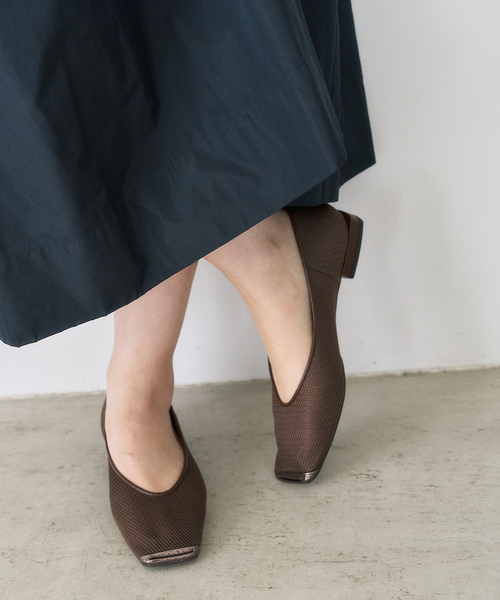 昨年大人気だったメタルトゥキャップメッシュフラットをリニューアル!つま先のメタルをさりげないカラーに変更し、より幅広いシーンで履いていただけます。まだ寒い時期からでも履きたくなる、キャッチーなカジュアルフラットシューズ。落ち着いたカラーリングのネット素材を採用し、さらにオーガンジー素材を重ねてお作りしているので優しい透け感なのもこの時期嬉しいポイント。つま先のメタルとオーバーヒールで程よくモードな印象に。デイリーからお仕事シーンまで幅広く活躍する1足です。**********************【スタッフ着用コメント】《スタッフS》普段サイズ:23.5/着用サイズ:23.5サイズ感: いつものサイズでぴったり履き心地:素足で履いて丁度よいサイズ感でした。ネットとオーガンジーの素材なので締め付け感なくつま先もワイドスクエアなので幅広の私には丁度よかったです。***********************照明の関係により、実際よりも色味が違って見える場合があります。またパソコン・スマートフォンなどの環境により、若干製品と画像のカラーが異なる場合もございます。*商品の色味は、商品アップ画像をご参照ください。