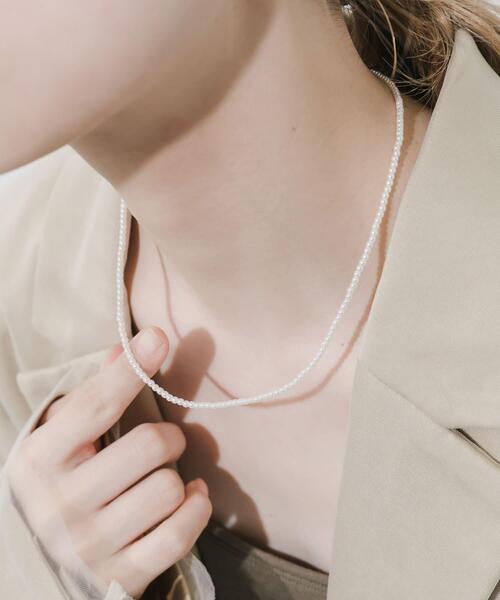 【デコルテを繊細に彩る小粒パール】 ●極小サイズのパールを連ねた華奢なデザイン ●肌に優しく錆びにくいサージカルステンレス素材 ●オンオフ問わず使える万能なシンプルさ 控えめなサイズ感ながらもパールの柔らかな光沢が首元を明るく上品に見せてくれるネックレス。 主張しすぎないデザインなので、ジャケットのインナーに合わせたり、Tシャツなどのカジュアルコーデにさらりと合わせたりと幅広くマッチ。 単体で着けてデコルテを美しく見せるのはもちろん、重ね付けのベースとしても重宝する大人のベーシックアイテムです。 腐食に強く錆びにくいサージカルステンレスを採用した、金属アレルギーにも対応したアクセサリーです。 【2026 Spring/Summer】【26SS】 【サージカルステンレスとは・・】 ・通常のステンレス材よりも、より腐食に強く錆びにくい。 ・医療器具にも使用されており、金属アレルギーに対応した素材。 ・お風呂などの水に触れるシーンで付けっぱなしにしても、錆びたり変色したりしにくい。 ※アレルギーの原因はさまざまです。すべての方に起きないことをお約束するものではありませんので、予めご了承くださいませ。また、症状が出た場合は直ちに使用をお控えください。 ※アレルギー体質の方や体調が低下している方など、かぶれることがありますので十分にご注意ください。 ※サージカルステンレスは、腐食に強く錆びにくい特徴がございますが、製品状態を永久保証するものではございません。使用状況によって劣化は異なりますので、ご了承ください。 ※その他お取り扱いに関しましては、商品に付属のアテンションタグをご覧ください。 総重量 : 約2.5g ※商品画像は、光の当たり具合やパソコンなどの閲覧環境により、実際の色味と異なって見える場合がございます。予めご了承ください。 ※商品の色味の目安は、商品単体の画像をご参照ください。 ▼お気に入り登録のおすすめ▼ お気に入り登録商品は、マイページにて現在の価格情報や在庫状況の確認が可能です。 お買い物リストの管理にぜひご利用下さい。 -