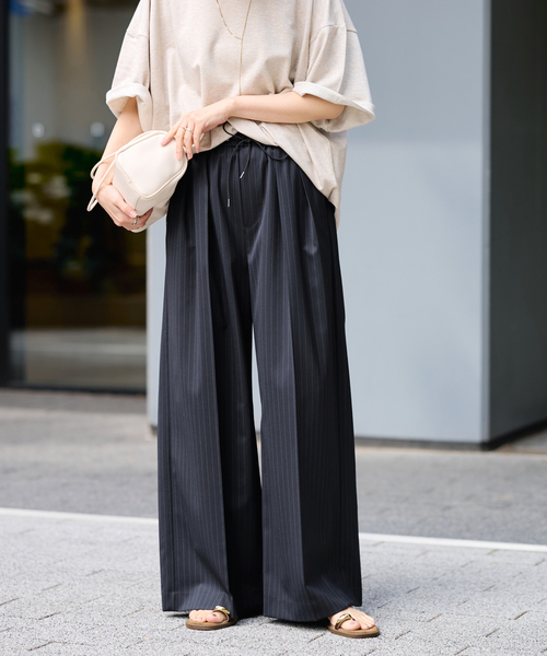 ≪二宮こずえさん×FRAMeWORKの動画でご紹介アイテム!≫ 上質やツヤ感が魅力のストライプワイドパンツ。 ウール混のしなやかさとストレッチ性を持つポリエステルを掛け合わせた素材で、スーツ生地ならではの美しいツヤ感が魅力。 控えめなストライプ柄で着回しがしやすく、オンオフどちらでも活躍します。 インタックを入れたワイドシルエットは今年らしいモードな雰囲気に加え、スポーティなディテールをプラスして新鮮な印象に。 セットアップでのきれいめスタイルはもちろん、スニーカー合わせでカジュアルダウンもおすすめです。 ********************** 透け感:なし 裏地:なし 伸縮性:なし 光沢感:なし 生地の厚さ:普通 ********************** ※シリーズのご案内 TWストライプショートシャツ(26050220712010) TWストライプバイアススカート(26060220713010) ※取り扱いについては、商品についている品質表示でご確認ください。 ※こちらの商品は、FRAMeWORK での取り扱いになります。 直接店舗へお問い合わせの際は FRAMeWORK 店舗へお願い致します。 ※照明の関係により、実際よりも色味が違って見える場合があります。 またパソコン・スマートフォンなどの環境により、若干製品と画像のカラーが異なる場合もございます。 予めご了承の上ご注文ください。 ※商品の色味は、商品アップ画像をご参照ください。 本体:手洗い可能