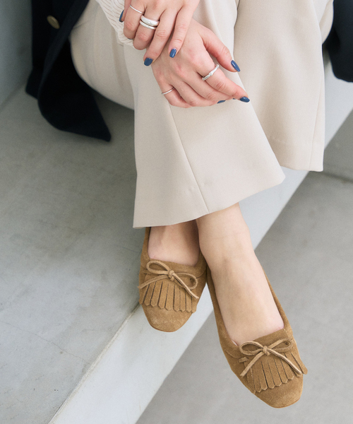 人気のキルトタッセルフラットに新色が登場! 爽やかなサックスブルーは春のスタイリングにぴったり。 トレンドのボヘミアンムードなスタイリングに取り入れたい、フリンジディテールのフラットシューズ。 牛革の一枚仕立てでくったりこなれた雰囲気に仕立てたこだわりの1足です。 アッパーとタッセルは同じ素材で作成しているので統一感があり、きれいめなスタイリングにも合わせやすいタッセルシューズに。 甲はやや浅めなので女性らしいシルエットでお楽しみいただけます。 ********************** 【スタッフ着用コメント】 《スタッフU》 普段サイズ:23.5/着用サイズ:23.5 サイズ感: 素足で履いて丁度よい 履き心地:いつものサイズを素足で履いてぴったり でした。甲は浅いですがフィット感があるので 安定感あります。 レザーなので馴染んで来たらソックス合わせも 出来そうです。 ********************** *摩擦や濡れた状態での色移りにご注意ください。 *天然皮革を使用した商品の為、商品の仕上がりに個体差が生じます。傷やシワ・色ムラ等につきましても、予めご了承ください。 *天然素材を使用した商品の為、毛並みや色味、毛の長さ等に個体差がございます。 *照明の関係により、実際よりも色味が違って見える場合があります。 またパソコン・スマートフォンなどの環境により、若干製品と画像のカラーが異なる場合もございます。 *商品の色味は、商品アップ画像をご参照ください。