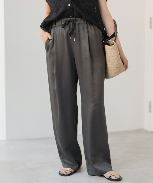 新色カーキが加わり、人気のサテンイージーパンツが待望の追加決定!・こちらの商品は25030200832020、25030200832120追加商品です。・ブラック、グレーはリピート。カーキは新色です。・追加生産商品は、一部の店舗や通販で販売されている場合がございます。あらかじめご了承ください。・同一商品でも個体差により、採寸サイズに若干の差が生じる場合がございます。・レビュー内容には、品番の異なる同商品のレビューが含まれている場合があり、現在展開していないカラーやサイズの内容が含まれることがございます。スタイリングにさりげなく差をつけてくれるサテンイージーパンツ。マットな光沢とワッシャー加工を施すことで、きらつきすぎない上品な艶と、表情のある風合いに仕上げました。ほどよく艶を抑えたサテン素材は、落ち着きのある華やかさが魅力。さらに、肌離れの良いさらっとした質感で、穿き心地をキープしてくれます。シンプルなトップスを合わせるだけで、コーデがぐっと大人っぽく見える一本。素材の力で洗練された印象を叶える、“大人のためのサテンパンツ”です。#イージーケア #手洗い可能**********************透け感:なし裏地:なし伸縮性:なし光沢感:ややあり生地の厚さ:普通**********************【スタッフ着用コメント】《スタッフS》20代後半/身長:158cm/普通/普段サイズ:S/着用サイズ:36サイズ感:身体のラインを拾わない程よくルーズなシルエット。36を着用して、シューズを履いて丁度いい丈感でした。素材感:落ち感と光沢感のあるきれい目な素材。厚手すぎず薄手すぎない生地感でシーズンレスに使えそう。着心地:ウエストゴム&紐で調整ができリラックスした穿き心地です。タック入りできちんと感もあるので、オフィスシーン等にもおすすめ◎**********************※取り扱いについては、商品についている品質表示でご確認ください。※こちらの商品は、Spick & Spanでの取り扱いになります。 直接店舗へお問い合わせの際は Spick & Span店舗へお願い致します。※照明の関係により、実際よりも色味が違って見える場合があります。またパソコン・スマートフォンなどの環境により、若干製品と画像のカラーが異なる場合もございます。※商品の色味は、商品アップ画像をご参照ください。カーキ着用スタッフ:160cm 着用サイズ:38グレー着用スタッフ:157cm 着用サイズ:36ベージュ着用スタッフ:160cm 着用サイズ:38カーキ詳細着用スタッフ:162cm 着用サイズ:38グレー詳細着用スタッフ:162cm 着用サイズ:36ベージュ詳細着用スタッフ:162cm 着用サイズ:38本体:手洗い可能
