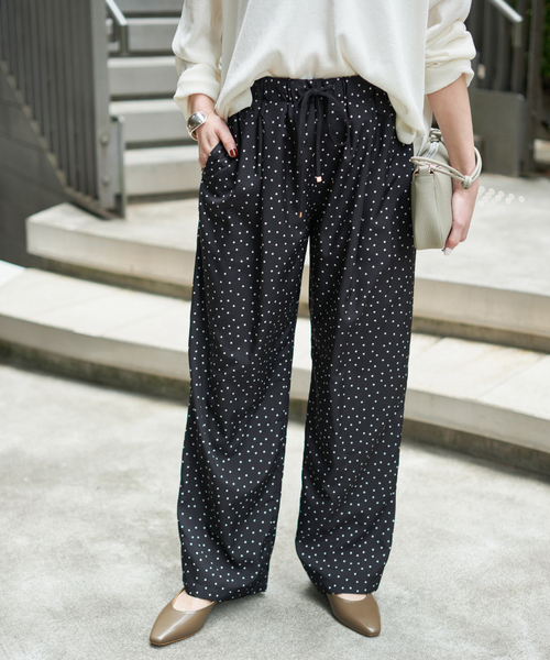 大人気のドットイージーパンツが、WEB限定で待望の追加決定! ・こちらの商品は25030200904010、25030200904110の追加商品です。 ・ブラックベースのみリピート。 ・本品番はオンライン限定での展開です。 ・追加生産商品は、一部の店舗や通販で販売されている場合がございます。あらかじめご了承ください。 ・同一商品でも個体差により、採寸サイズに若干の差が生じる場合がございます。 小さめのランダムドットがさりげなく散りばめられたストレートパンツ。 シワになりにくいポリエステル素材で、ふんわりとした柔らかい風合いと薄手の素材感でサラッとしたイージーな履き心地に。 裏地も膝あたりまで付いているので、透け感を気にせずに着用いただけます。 細かなドットは甘くなりすぎず、大人カジュアルなスタイリングが完成。 ドットがスタイリングの主役になるので、シンプルなアイテムとの相性抜群です。 ワンピースなどとのレイヤードにも使えて、汎用性の高いデイリーアイテム。 ********************** 透け感:なし 裏地:あり 伸縮性:ややあり 光沢感:なし 生地の厚さ:やや薄め ********************** 【スタッフ着用コメント】 《スタッフI》 40代前半/身長:164cm/普通/普段サイズ:M~L/着用サイズ:38 サイズ感:ゆったりとしたワイドめなシルエットで、身体のラインを拾わずに着用できます。 素材感:軽めで落ち感があり綺麗なストレート。ウエストがゴム仕様で楽でした。 着心地:さらっとしていて軽めの素材感で穿き心地良いです。 裏地の境目が気になるものも多いですが、こちらのアイテムは境目も透け感も気にならず安心して履けます。 ********************* ※取り扱いについては、商品についている品質表示でご確認ください。 ※こちらの品番は、Spick & Span オンライン限定での取り扱いになります。全店舗でのお取り扱いはございませんのでご注意ください。なお、入荷店舗は予告なく変更になる場合がございます。 ※照明の関係により、実際よりも色味が違って見える場合があります。 またパソコン・スマートフォンなどの環境により、若干製品と画像のカラーが異なる場合もございます。 ※商品の色味は、商品アップ画像をご参照ください。 ブラックベース着用スタッフ:160cm 着用サイズ:38 ブラックベース詳細着用スタッフ:162cm 着用サイズ:38 本体:手洗い可能