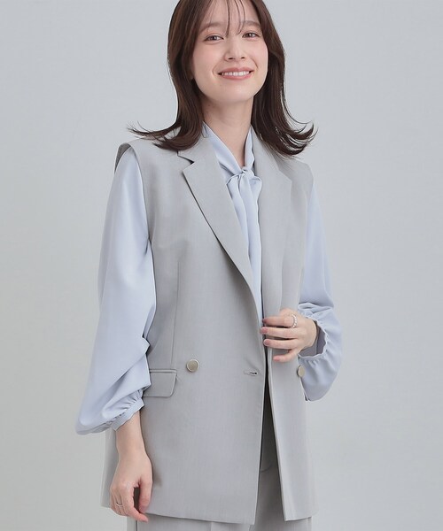 【デザイン】かっちりしすぎないバランスにこだわったダブルブレストのテーラードジレ。マニッシュな印象になりがちなアイテムをすっきり見えするサイズ感にこだわりました。腰周りからヒップまでをきれいにカバーする着丈もポイント。サッと羽織るだけでこなれた印象になるアイテムです。程よい厚みの生地感なのでロングシーズン着用いただけます。同素材で、ジャケットとパンツをお作りしていますので、セットアップでの着用も可能です。※同素材アイテム品番・・・ジャケット(C62-45302)、パンツ(C62-65304)【スタイリング】同素材のパンツとセットアップで着たいただくのがおすすめです。その他、ナロースカートやふんわりスカートを合わせたフェミニンミックスのスタイルにもマッチします。ワンピースの上に羽織るのもアクセントに。お仕事着やセレモニーなどかっちりしたシーンにはブラウスを合わせていただくのがおすすめ。お袖にボリュームがあったり、フリルやボウタイなどの女性らしいディテールのインナーを合わせていただくと上品なコーデが完成。デイリーなシーンには、リブニットやロンTなどのカジュアルなアイテムと合わせていただくとバランス良く決まります。厚手すぎない素材なので、半袖のTシャツを着る時期までロングシーズン楽しめます。【素材】滑らかな手触り、軽やかで表面が美しく、洗濯後しわになりにくい素材を使用しています。【仕様】・ポケット数:横×2・裏地あり※照明の関係により、実際よりも色味が違って見える場合があります。また、パソコン・スマートフォンなどの環境により、若干製品と画像のカラーが異なる場合もございます。モデル情報:身長166cm B80 W59 H85 着用サイズ:02(M)店舗へのお問い合わせ商品番号:C62-25302●製品寸法:01(S):着丈65cm B93cm 肩幅39cm02(M):着丈66cm B96cm 肩幅40cm03(L):着丈67cm B99cm 肩幅41cm04(LL):着丈68cm B102cm 肩幅42cm備考: