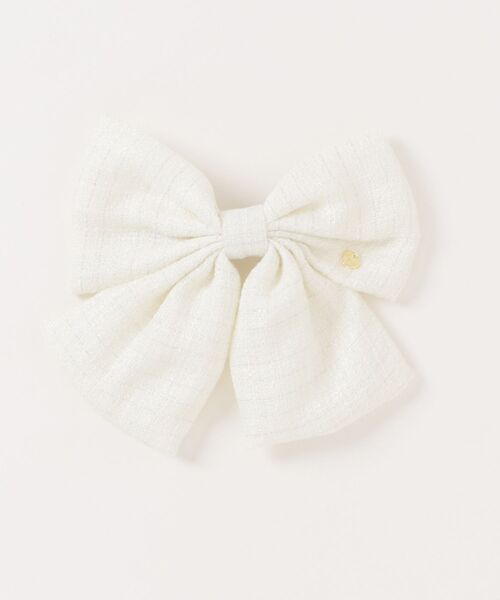 キラキラのラメを織り込んだツイード素材のリボンバレッタ。大きめのサイズでコーディネイトのアクセントにぴったりです。ブランドロゴが入ったハート型のゴールドパーツがキュート。サッとまとめてパチッと留められるのでヘアアレンジも簡単です。クラシカル&華やかなアイテムなのでオンオフ問わずに活躍すること間違いナシ。