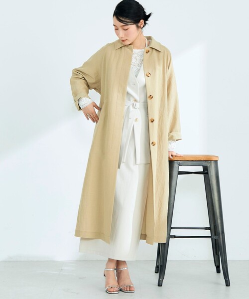"◇fredy emue◇【2026 SS】きれいめもカジュアルも決まる、リネン混ステンカラーコート●point・スタンドカラーとしても着用可能な2way仕様・ウエストに通したベルトを結ぶことで、シルエットにメリハリをプラス・ラグランスリーブ仕様で、肩まわりがすっきり見えつつ動きやすい着心地・ゆったりとしたサイズ感ながら、落ち感があり大人っぽくきれいに着こなせる一着・ロング丈でも重たく見えず、デイリーからきれいめスタイルまで幅広く活躍・ウエストや首元、袖など細部までこだわり、どこから見ても洗練された仕上がり・定番ステンカラーコートを、今の気分にアップデートした春アウター●STAFF着用コメント156cmスタッフ(38サイズ着用):ゆったりしていますが、落ち感がありすっきり着られました!ベルトを結ぶとシルエットにメリハリが出ます。ロング丈でも重たく見えず、きれいめにもカジュアルにも使いやすいです◎透け感:なし裏地:なし伸縮性:なし光沢感:なし洗濯:水洗い不可◇商品のお気に入り登録◇気になる商品は、お気に入り登録がオススメです!クーポン情報、入荷情報が、通知されるようになります。※お手入れの際は、商品についている品質表示タグの取扱い表示をご確認ください。●お取扱い上のご注意●*商品を長くご愛用していただきたいため、アテンションタグがある場合は必ずご確認の上、着用又はお取り扱い下さい。*画像の商品はサンプルとなりますので実際の商品と仕様(主にファスナー・釦等の付属品)、加工、サイズが若干異なる場合がございます。*店頭及び屋外での撮影画像は、光の当たり具合で色味が違って見える場合があります。商品の色味は、スタジオ撮影の画像をご参照下さい。*商品画像に関しては出来る限り忠実に表示出来るよう努めておりますが、お客様がご利用のモニターの設定及び特性により、実際の商品と比較し色味に若干の誤差が生じる場合があります。*製品洗い加工の商品は、多少の歪み、シワなどが見られたり、風合いやサイズ等が1枚1枚異なります。汗や雨等で濡れた時や、摩擦により色落ちし、他の衣料を汚すことがありますので(特に濃色のもの)ご注意ください。*この製品は、生地の特性上引っかかると糸が飛び出しやすい傾向があります。着用時にはベルトやバック、周囲の壁など表面の粗いものとの摩擦や引っかかりにご注意ください。※サンプルでの採寸のため、サイズ表はあくまで目安となります。予めご了承ください。"