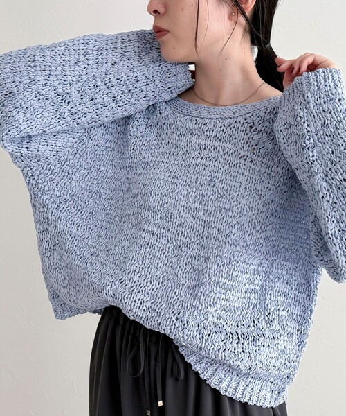 "◇fredy emue◇【2026 SS】ゆるっとこなれた着こなしが叶うテープヤーンニット●point・立体感のある編み地で表情豊かなニットプルオーバー・程よく透け感のある編み地で、軽やかで春夏らしい印象に・ゆとりのあるシルエットながら、やや短めの丈感でバランスよく着られます・デコルテ周りをきれいに見せてくれるネックラインもポイント・伸縮性のある柔らかな生地感で、リラックスした着心地も魅力・ロンTを重ねたレイヤードスタイルや、タンクトップとの軽やかな着こなしもおすすめです●STAFF着用コメント156cmスタッフ(38サイズ着用):ゆとりはありますが、丈が短めなのでバランスよく着られました!程よい透け感で、春夏らしい軽やかな印象です。インナー次第で雰囲気を変えられ、着回ししやすいです◎透け感:あり裏地:なし伸縮性:あり光沢感:なし洗濯:手洗い可◇商品のお気に入り登録◇気になる商品は、お気に入り登録がオススメです!クーポン情報、入荷情報が、通知されるようになります。※お手入れの際は、商品についている品質表示タグの取扱い表示をご確認ください。●お取扱い上のご注意●*商品を長くご愛用していただきたいため、アテンションタグがある場合は必ずご確認の上、着用又はお取り扱い下さい。*画像の商品はサンプルとなりますので実際の商品と仕様(主にファスナー・釦等の付属品)、加工、サイズが若干異なる場合がございます。*店頭及び屋外での撮影画像は、光の当たり具合で色味が違って見える場合があります。商品の色味は、スタジオ撮影の画像をご参照下さい。*商品画像に関しては出来る限り忠実に表示出来るよう努めておりますが、お客様がご利用のモニターの設定及び特性により、実際の商品と比較し色味に若干の誤差が生じる場合があります。*製品洗い加工の商品は、多少の歪み、シワなどが見られたり、風合いやサイズ等が1枚1枚異なります。汗や雨等で濡れた時や、摩擦により色落ちし、他の衣料を汚すことがありますので(特に濃色のもの)ご注意ください。*この製品は、生地の特性上引っかかると糸が飛び出しやすい傾向があります。着用時にはベルトやバック、周囲の壁など表面の粗いものとの摩擦や引っかかりにご注意ください。※サンプルでの採寸のため、サイズ表はあくまで目安となります。予めご了承ください。"