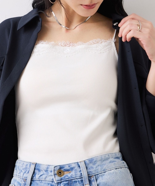 【2026 Spring】【26SS】 <POINT> ・カップ付きなので、ブラジャー不要! 【デザイン・シルエット】 フェミニンなレースが胸元と裾についたデザインキャミソール。 シャツ、ジャケット、カーディガンなどの羽織アイテムのインナーとして、さりげないフェミニンスタイリングにプラスワンアイテムとして大活躍間違いなし! 【素材】 身頃は程よいテンションのあるストレッチコットンテレコ素材。 レースは繊細でソフトなトーションレース。 【カラー】 何にでも合わせやすいベーシックなブラック、ライトグレー、オフホワイトの3色展開です。 【おすすめのスタイリング】 レイヤードした時に、胸元のレースが見えるような羽織りアイテム(シャツ、ジャケット、Vネックカーディガン)がおすすめ! ----------------------------- 裏地:なし 光沢感:なし 透け感:なし 伸縮性:あり 生地の厚さ:普通 季節:春、夏、秋、冬 ----------------------------- 【モデル着用サイズ】 身長:168cm 着用サイズ:F ※画像の商品はサンプルです。 実際の商品と仕様、加工、サイズが若干異なる場合がございます。 ※画像によっては実際の色味と異なる場合があります。正しい色味は生地アップ画像をご確認ください。