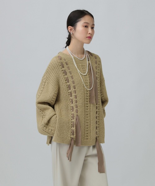 表面感豊かな綿のロービングスラブ糸を使ったプルオーバー【デザイン】オリジナルの縦模様の編柄がほっこりし過ぎないナチュナル感を演出しています。更にポリエステルのサテンテープを手作業で編み込むことでデザイン性のある1枚に仕上がっています!【スタイリング】・緩さのあるシルエットの為、細身パンツやナロースカートなどのすっきりボトムスと合わせるのがおすすめです。---------------------------------------------------【気になる商品はお気に入り登録がおすすめ!】・在庫残りわずか・再入荷・セールの情報などの通知を受け取ることができます。気になる商品は♡をクリックして、「お気に入り登録」しましょう!【ショップ・ブランドのお気に入り登録も!】新商品や再入荷、セール、クーポンの配布など、いち早くお得な情報を受け取ることができます。---------------------------------------------------