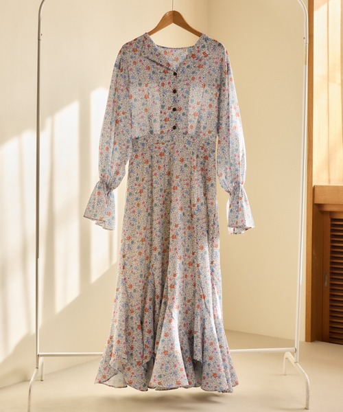 ーーーヴィンテージ感漂う花柄をオリジナルで起こしたフラワープリントワンピース。■point・マルチカラーのドット×花柄をデシンの生地にプリントし、華やかだけどこびない花柄に仕上げました・スカート部分は人気のエスカルゴ型なので、歩く度に華やかに揺れる裾の動きがポイント・襟回りはオープンカラーに仕上げ、クラシカルなムードをプラス・表地・裏地ともにポリエステル100%でお手入れしやすい素材・袖口もシャーリングゴムになっており、着心地やスタイルの変化をお楽しみいただけますーーー■styling1枚で華やかに決まるワンピースですが、オープンカラーなのでハイネックインナーをレイヤードする着こなしもおすすめ。春定番のデニムジャケットや、甘辛テイストでミリタリーブルゾンを上に羽織るのも◎※屋外の光や照明の当たり具合で、実際の商品の色味とカラー別画像の色味に若干の違いが発生する場合がござい 詳細画像と併せてご確認の上、ご注文いただきますようお願い致します。【INFORMATION】■商品のお気に入り登録完売していても再入荷時に再入荷通知を受け取ることができますので、是非ご登録ください!■ブランドのお気に入り登録新商品や再入荷などの情報を受け取ることができますので、是非ご登録ください!