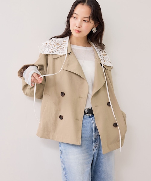 【2026 Spring】【26SS】 <POINT> ・通勤だけでなくオフでも着られるショート丈トレンチコート。 ・軽い素材感でシーン選ばずさっと羽織るのに◎ ・釦をトップまで閉めるとステンカラーにも変化させられます! 【デザイン・シルエット】 お仕事着に限定せず幅広いシーンで着まわせるトレンチコートにしたいという思いでショート丈を採用しました。裾に広がりがあるシルエットでバックスタイルの抜かりなく美しく◎。袖口のベルトでサイズ調整が可能でキャンディスリーブのように変化を持たせることも可能です。フロント釦をトップまで締めるとステンカラーでご着用いただけます。 ボトムを選ばず羽織れる丈感、ボリューム感で長くご着用いただけるトレンチコートです。 【素材】 柔らかく軽い素材。程よく表面感があります。 UVケア、撥水機能、花粉ガード付きで天候や環境の変化にも対応できるコート。 【カラー】 ベーシックなベージュとスタイリッシュなネイビーの2色展開。 【おすすめのスタイリング】 コンフォートツイルシリーズと相性◎。1着持っているとフォーマルなセレモニーなどの羽織からデニムスタイルまでシーンを選ばず活躍すること間違いなしです! ----------------------------- 裏地:あり 光沢感:ややあり 透け感:なし 伸縮性:なし ポケット:あり ボタン:あり(開閉可) 生地の厚さ:普通 その他仕様:袖口はボタンで調整が可能 季節:春、秋 ----------------------------- 【モデル着用サイズ】 身長:160cm 着用サイズ:F ※画像の商品はサンプルです。実際の商品と仕様、加工、サイズが若干異なる場合がございます。 ※画像によっては実際の色味と異なる場合があります。正しい色味は生地アップ画像をご確認ください。