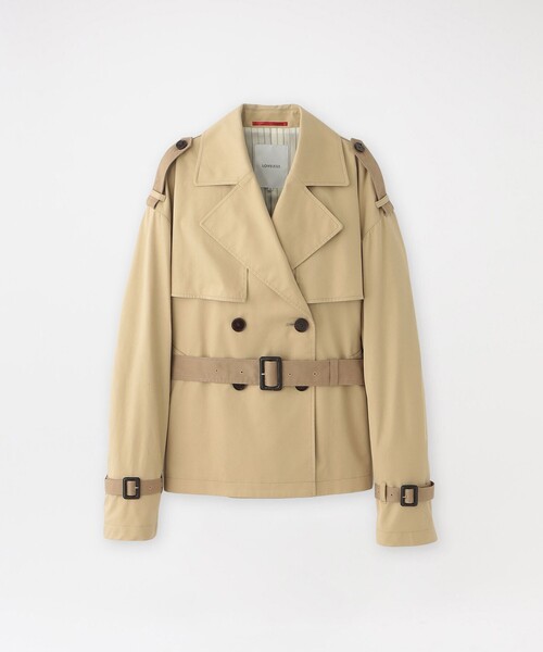 ベージュトーンでブロッキングした、ゆったりサイズのショートトレンチコート 【素材】 ポリエステル×コットンを使用した、トレンチコート定番のツイル素材。 コットンの自然な風合い、ポリエステルの程よいハリ感と軽さを兼ね備え、きれいなフォルムを保ちながら快適に着用いただけます。 【シルエット/デザイン】 軽さのあるショート丈で、バランスが取りやすく幅広いシーンに対応するデザイン。 背ヨーク・肩章・ウエストベルト・袖ベルトに同素材の濃色を配色にすることで、全体を引き締めています。 程よくゆとりのあるシルエットながら、素材の落ち感によりニュアンスを演出。 フロントには長めのヨーク(ガンパッチ)を配し、縦のラインを強調。全体をすっきりと見せながら、デザインのアクセントになっています。 【スタイリング/その他】 落ち着いたベージュトーンで、オン・オフ問わず取り入れやすい一着。 パンツからスカート、ワンピースまで幅広く合わせやすく、季節の変わり目に長く活躍します。 さっと羽織るだけでスタイリングが決まり、デイリーからきれいめカジュアルまで、着回し力の高い主役アウターです。 ━━━━━━━━━━━━━━━━━━━━━━━━━━ お買い物をお楽しみ頂くために <商品のお気に入り登録> 完売カラーの再入荷通知など、お得な情報をお届けします。 <注意事項> この商品はサンプルでの撮影を行っています。 実際の商品とイメージが異なる場合がございます。 撮影環境により、光の当たり具合で色味が違って見える場合があります。あらかじめご了承下さい。
