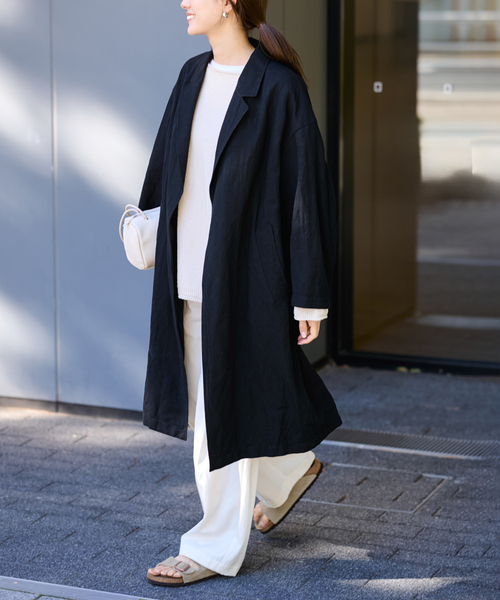 ◆大人気だった綿×麻の春コートが再入荷!・旧品番23020220600010の追加品番です。・混率を変更しておりますが、大きな風合いの変化はございません。・グレー(006)はWEB限定カラーです。・同一商品でも個体差が生じるため、採寸内容に若干の差が生じる場合がございます。ラフに着流せるポプリンコート。縦糸に綿、緯糸に麻を使用し、高密度に織られたしっかりとした肉厚の生地を使用。タンブラー加工を施すことで、洗いざらしたようなこなれた風合いに仕上げています。釦のない着流しタイプのデザインで、オーバーサイズながらもすっきりと着られるように。ワークコートをイメージして、無駄なディテールをそぎ落としたシンプルさが魅力の一着です。**********************透け感:なし裏地:あり伸縮性:なし光沢感:なし生地の厚さ:普通**********************※取り扱いについては、商品についている品質表示でご確認ください。※こちらの商品は、FRAMeWORK での取り扱いになります。直接店舗へお問い合わせの際は FRAMeWORK 店舗へお願い致します。※照明の関係により、実際よりも色味が違って見える場合があります。またパソコン・スマートフォンなどの環境により、若干製品と画像のカラーが異なる場合もございます。予めご了承の上ご注文ください。※商品の色味は、商品アップ画像をご参照ください。本体:手洗い可能