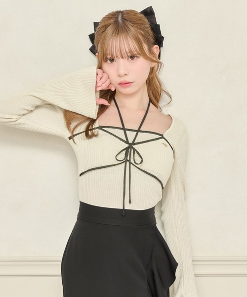 ◆さりげない色気を仕込む、大人ガーリーなリボンニットトップス♡繊細なリブ素材に、配色ラインが映える大人ガーリーなニットトップス。シンプルながらもひと目で印象に残るデザインが魅力の一枚です。左胸元にはapres jourオリジナルのチャームをあしらい、さりげないアクセントをプラス。フロントのリボン部分は絞れる仕様になっており、ギャザーの寄せ方で表情を変えられる2wayデザイン♡デコルテには華奢なストラップとリボンデティールをあしらい、程よい肌見せで甘くなりすぎず、どこか大人っぽい雰囲気に仕上がります。身体にも程よくフィットするシルエットでスタイルアップ効果も◎フレアスカートやマーメイドスカートと合わせればフェミニンに、パンツ合わせで大人っぽく仕上げるのもおすすめです。一枚でコーデが映える主役級トップスなので、いつものお洋服にプラスするだけで旬の垢抜けスタイルが完成します♡---------------------------------------透け感:ややあり伸縮性:あり裏地:なし---------------------------------------※ご覧のモニター環境や撮影環境により実際の商品と多少色味が異なって見える場合がございます。ご理解の程よろしくお願いいたします。※濃色品は、色落ち・色移りをする恐れがあります。摩擦(特に湿った状態での摩擦)や汗や雨などで他の衣料や下着(特に白物)に色移りしますので、十分ご注意ください。【お買い物をよりお楽しみいただく為に♪】▼商品のお気に入り登録をおすすめします♡をクリック!完売カラーの再入荷や、ラスト1点の通知、セールの際の通知を受ける事ができます。ブランドのお気に入り登録もご一緒にお願い致します。