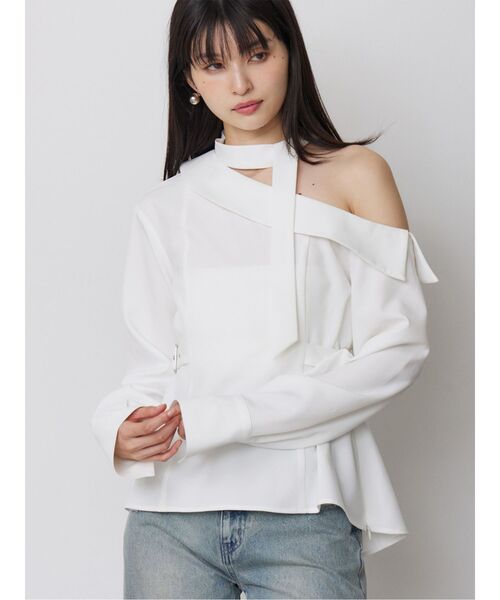 トレンドのリボンタイデザインのブラウス ワンショルデザインで抜け感も◎ ■アイテム トレンド感あふれる首元のリボンタイは取り外し可能で、スタイリングに合わせたアレンジが楽しめるトップスです。 アシンメトリーなワンショルデザインが抜け感を演出し、ウエスト部分のベルトでスタイルアップ効果も叶えます。 ボディラインを拾いすぎないサイズ感で、ウエストをすっきり見せてくれるシルエットです。 後ろ着丈が長いので、気になる腰回りをカバーすることができます。 落ち感のある素材を使用し、きれいめにもモードにも着用しやすい仕上がりです。 ミニスカートやショートパンツ合わせでモードに、ナロースカート合わせで大人っぽい着こなしもおすすめです。 -------------------------------------------- 生地の厚さ:普通 伸縮性:なし 透け感:なし(ホワイトはややあり) サイズ感:普通 裏地:なし -------------------------------------------- 【知って得する便利機能◎ 】 ■商品のお気に入り登録 再入荷時、ラスト1点の時にお知らせします。 ■ブランドのお気に入り登録 新商品やお得な情報など、いち早くお得な情報をゲット! ぜひご活用ください! ※着用画像はフラッシュの加減で実際の製品と色味等が異なる場合がございますので、生地のズームアップ画像をご確認ください。 ※ご利用の端末画面の設定により実際の商品と色味が異なる場合がございます。