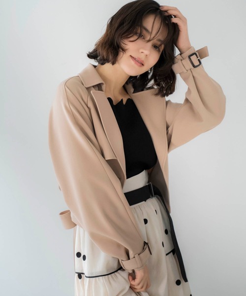 コンパクトな丈感でスタイルアップが叶う、今季主役のショートトレンチコート。ボリュームボトムからナローラインまで幅広く合わせやすく、裏地のない軽やかな仕立てで長い季節に活躍します。ラグランスリーブとバックタックが生む柔らかな丸みが、短丈でも窮屈さのない立体的なシルエットを演出。ウエストベルト付きで、結び方次第で印象を変えられるのも魅力です。前を閉じてきちんと感のある着こなしはもちろん、前を開けてラフに羽織っても様になるデザイン。さらっと羽織るだけで女性らしいバランスが整い、フェミニンにもカジュアルにも寄せられる1着です。■商品特徴裏地:なし生地の厚さ:普通透け感:なし伸縮性:なしポケット:なしファスナー:なし※不良品や配送不備以外での返品・交換はお受けいたしかねます。あらかじめご了承ください。※掲載商品はサンプルのため、実際の商品とは色味・仕様・加工・サイズ等が若干異なる場合がございます。あらかじめご了承ください。※商品の詳細な色味・仕様につきましては、商品単体のトルソー画像をご参照ください。※撮影時の照明やご利用のパソコン・スマートフォンの設定により、実際の色味と異なって見える場合がございます。あらかじめご了承ください。