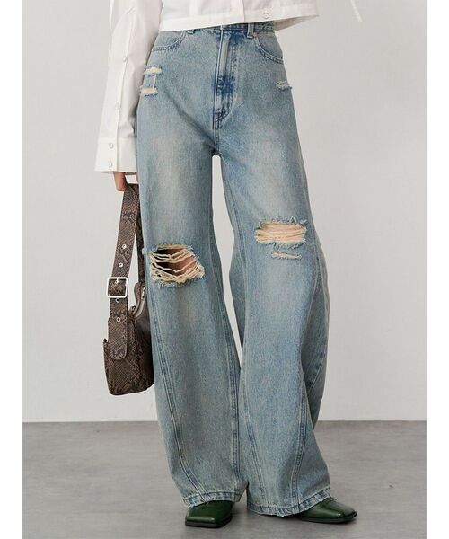 バレルレッグシルエットのデニム ダメージデザインもアクセントに! ■アイテム トレンドのバレルレッグ型とダメージデザインを組み合わせたデニムパンツです。 厚めのデニムを使用し、上からオーバーダイ加工を施しているので、色味も絶妙でおしゃれなアイテムとなっています。 ウエストはフィットするのに対し、ヒップ周りは少し幅を出しているのでヒップアップ効果も◎ 短丈のカットソーアイテムやニットアイテムとの相性抜群です。 季節問わずロングシーズン着用できるアイテムです。 -------------------------------------------- 透け感:なし 生地の厚さ:普通 伸縮性:なし サイズ感:普通 -------------------------------------------- 【知って得する便利機能◎】 ■商品のお気に入り登録 再入荷時、ラスト1点の時にお知らせします。 ■ブランドのお気に入り登録 新商品やお得な情報など、いち早くお得な情報をゲット! ぜひご活用ください。 ※着用画像はフラッシュの加減で実際の製品と色味等が異なる場合がございますので、生地のズームアップ画像をご確認ください。 ※ご利用の端末画面の設定により実際の商品と色味が異なる場合がございます。