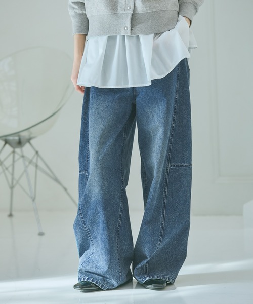 コクーンシルエットのデニム。腰回りに丸みがあり脚のラインを拾いにくく、立体的なシルエットが特徴の1本。体型カバー効果が高く、ゆったりとした穿き心地と旬なスタイルを両立できるアイテムです。【素材】綿混のオールシーズン活躍する素材感。【スタイリング】合わせるトップスを選ばずスタイリングできるアイテムです。ボリュームのあるシルエットなのでコンパクトなトップスとの相性〇