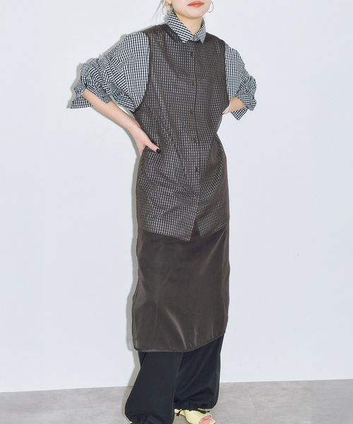 【2026SS】CITYSHOPSHEER DRESS / シアードレス■素材軽やかなシフォン素材を使用した、レイヤード前提のシアードレス。透け感があるので、合わせるインナー次第でさまざまな表情が楽しめます。■デザインアームホールを大きく開けたデザインで、タンクトップやスウェット、ニットとの重ね着もしやすい仕様に。一枚重ねるだけでスタイリングに抜け感をプラスしてくれる、万能レイヤードドレスです。**********************透け感:あり裏地:なし伸縮性:なし光沢感:なし生地の厚さ:薄い**********************【スタッフ着用コメント】《スタッフ》身長:160cm/普段サイズ:36/着用サイズ:36サイズ感:着丈はふくらはぎが隠れる位、身幅はストンと落ち感が出る位で、薄手のカットソーの上に楽に着られる位のサイズ感でした。素材感:薄手のチュール素材です。着心地:着心地はとても軽く、ストレッチ素材ではないですがアームホールの開きが大きくバックネックにボタンが付いていたので着脱もとても楽でした。**********************※取り扱いについては、商品についている品質表示でご確認ください。※照明の関係により、実際よりも色味が違って見える場合があります。またパソコン・スマートフォンなどの環境により、若干製品と画像のカラーが異なる場合もございます。※商品の色味は、商品アップ画像をご参照ください。本体:手洗い可能