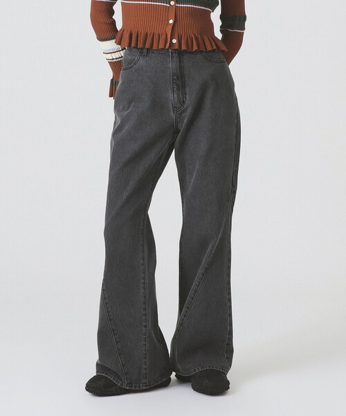 美シルエットで魅せる■デザイン膝下から美しく広がるフレアデニム。裾に大胆にあしらわれた三角マチのデザインがポイントです。立体的なカッティングが脚のラインをスマートに見せ、履くだけでスタイルアップを叶える美脚デニムに仕上がっています。■コーディネートフレアシルエットを活かして、タイトなトップスをインしたメリハリのある着こなしはもちろん、ワンピースやスカートの下に忍ばせたレイヤードスタイルもおすすめです。■素材程よい厚みとタフさを兼ね備えた11.5オンスの定番デニム素材。■ケア方法洗濯可(詳細は商品についている品質表示ラベルをご覧ください)※漬け置きは行わないでください。※摩擦や汗、水に濡れた場合、他の物への色移りにご注意ください。※淡色との組み合わせにご注意ください。※洗濯により色落ちします。濡れたまま放置しないでください。※光がよく当たる所で保管せず、湿気が少なく通気の良い場所で保管してください。【BLACK】Model:H168 B81 W60 H89 Size:(画像の商品はサンプル用サイズのため実際のサイズ感と異なります)【BLUE】Model:H175 B78 W59 H89 Size:(画像の商品はサンプル用サイズのため実際のサイズ感と異なります)※カラーによって素材が異なります。予めご了承ください。※光の当たり具合やパソコンなどの閲覧環境によって、実際の色味と異なって見える場合がございます。予めご了承ください。※商品の色味は商品単体で撮影した画像をご参照ください。
