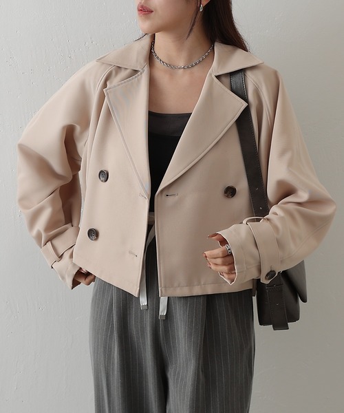 【春の定番アウターはショート丈ですっきり感を◎】さっと羽織るだけでスタイリングが決まる、ショートトレンチコート。腰位置を高く見せるショート丈が全体のバランスを整え、身長を問わずスタイルアップ見えを叶えます。ワイドパンツやフレアスカートと合わせることで、全体にメリハリのあるシルエットになるのもおすすめポイントです。背中にはアクセントになる切り替えデザインを施し、後ろ裾はゴム仕様にすることで、自然な丸みと立体感のあるシルエットを演出。袖は程よくゆとりを持たせているため、インナーを着込んでもごわつきにくく、快適な着心地です。袖口は二段階ボタンで調節可能で、ボタンを留めることで袖にふんわりとしたボリュームが生まれ、手元まで女性らしい印象に仕上がります。軽やかな着心地ながらきちんと感もあり、デイリーから通勤まで幅広く活躍する一着です。【商品ポイント】・ショート丈なのでバランスの取れた着こなしに・背中の切り替えと後ろゴム仕様が、動きのある立体的なバックスタイルを演出・袖口はボタンの留め位置を変えられ、シルエットの変化を楽しめるデザイン・肩まわりと袖にゆとりを持たせ、レイヤードしやすい快適な着用感・オン・オフ問わず活躍してくれるライトアウター----------------------------------------------------■商品特徴洗 濯 方 法 :手洗い可裏 地 :なし透 け 感 :なし伸 縮 性 :なし光 沢 感 :なし生地の厚さ:普通----------------------------------------------------■素材ポリエステル100%----------------------------------------------------※着用、お取り扱いの際は、商品についている品質表示とアテンションタグを必ずご確認下さい。※商品タグに記載されている商品名がWEBでの表記名と異なる場合があります。※実際の商品と仕様、加工、サイズが若干異なる場合がございます。※照明の関係により、実際よりもやや明るく見える場合がございます。またパソコンなどの環境により、若干製品と画像のカラーが異なる場合もございます。予めご了承くださいませ。【お気に入り登録】してお得な情報をCHECK!!・「商品のお気に入り登録」で再入荷通知や、ラストの通知、セール通知も受け取ることができます。・「ブランドのお気に入り登録」で新商品や再入荷など、お得な情報を受け取ることができます。