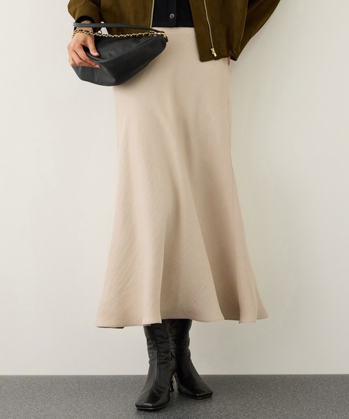 上品な光沢と快適な履き心地を両立。体型カバーも叶う美シルエットのサテンスカート【デザイン・シルエット】腰まわりはすっきりと、裾に向かって広がるマーメイドシルエットのスカート。フロントはフラットですっきり見え、バックウエストのみゴム仕様にすることで、きちんと感と快適な穿き心地を両立しています。【おすすめのスタイリング】ポロニットやカーディガンなどのニットトップスと好相性。トレンチコートやスエードブルゾンを合わせた、異素材ミックスのスタイリングがおすすめです。【素材】マットな光沢感のあるアセテート素材を高密度に織り上げ、仕上げに特殊なシワ加工を施しました。アセテート特有のなめらかな肌触りと程よい落ち感が、上品でエレガントな印象を演出します。----------------------------透け感:なし裏地:あり伸縮性:なし光沢感:あり生地の厚さ:中間ポケット:なし開き方:ファスナー開き----------------------------【モデル情報】モデル身長:175cm 着用サイズ:38※画像の商品はサンプルです。実際の商品と仕様、加工、サイズが異なる場合がございます。※撮影場所やライティング、お使いのモニター環境によって色の見え方が異なる場合がございます。※商品のカラーは画像の色味をご参照ください。動画は仕様説明のため、色味が実物と異なる場合がございます。