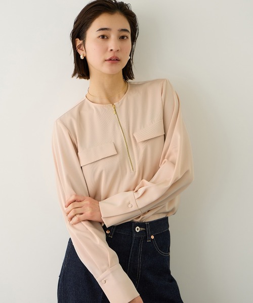 シンプルに差がつく、ゴールドZIPのポイントブラウス 【デザイン・シルエット】 フロントファスナー仕様のノーカラーブラウス。 イン・アウトどちらでもバランスよく決まる着丈で、シーズンを問わず活躍。ファスナーを少し開けることで、スキッパー風の抜け感ある着こなしも楽しめます。 【おすすめのスタイリング】 同素材のパンツやジャケットと合わせた3点セットのスタイリングがおすすめ。 デニムを合わせれば、程よくカジュアルダウンした着こなしも楽しめます。 【素材】 ・ダークブラウン(20)/ピンク(63):トリアセテートのツイル素材を使用。 高級感のあるツヤと、ウールのようなドライタッチを兼ね備え、しなやかなドレープ性が特徴です。 ややストレッチ性があり、発色が良く、シワになりにくい点も魅力。 ・ネイビー(40):色落ちしにくいリアクティブデニム素材。 上品なツヤ感と柔らかさがあり、デニムながらきれいめに着用できる素材感です。 ---------------------------- 透け感:ピンク(63)のみややあり 裏地:なし 伸縮性:なし 光沢感:なし 生地の厚さ:中間 ポケット:なし 開き方:ファスナー 洗濯:手洗い可能 ---------------------------- 【モデル情報】 モデル身長:171cm 着用サイズ:38(ショートヘア) モデル身長:175cm 着用サイズ:38(ロングヘア) 【3点セットアップ シリーズ】 同素材のデザイン違いでセットアップでも着られる フロントジップブラウス(品番: GGH26050) ベルテッドシングルジャケット(品番: GGV26050) イージータックワイドパンツ(品番: GGS26050) がございます。 ※画像の商品はサンプルです。実際の商品と仕様、加工、サイズが異なる場合がございます。 ※撮影場所やライティング、お使いのモニター環境によって色の見え方が異なる場合がございます。 ※商品のカラーは画像の色味をご参照ください。動画は仕様説明のため、色味が実物と異なる場合がございます。
