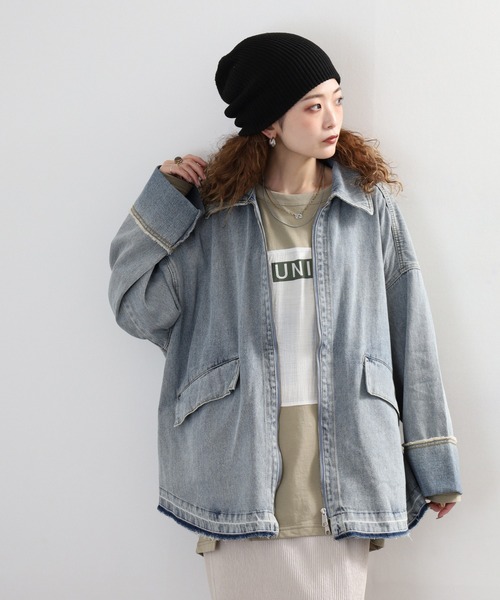 hunch/ハンチ ■pointゆったりとした、オーバーサイズのデニムブルゾン。着丈が長めなので、お尻も隠してくれます。 ダブルジップ仕様で裾を開けての着用も可愛いです。 長めの袖で折り返しのデザインがポイント! 袖口は裁ち切りにしており特有のused加工感が楽しめます。 カジュアルなスタイリングにはもちろん、甘めのスタイリングに合わせても◎ 袖口はお好みでロールUPして調整が可能です。 ■fabric 綿100%の10ozデニムで、通年使いやすい程よい厚み。 ブリーチのオーバーダイ加工が味のある表情を生み、デイリーに馴染む素材感。 ■silhouette ヒップまで隠れるミディ丈のオーバーサイズで、体型を選ばずゆったり着られるバランス。 長めの袖をロールアップすると立体感が出て、こなれたシルエットに。 ■coordinate 春らしい軽さを意識して、インナーにはとろみ素材のバンドカラーブラウスを合わせて女性らしさをプラス。 ボトムは細身のリブニットスカートを選び、ジャケットのボリュームとのメリハリをつくる。 足元はスクエアトゥのショートブーツで大人っぽくまとめ、バッグはレザーのワンハンドルバッグで上品さを添える。 アクセサリーには小ぶりのメタルイヤリングと華奢なリングを合わせ、デニムのカジュアルさとフェミニンさが調和した春の洗練スタイルが完成。 『OKシーン』 通勤・通学・買い物・散歩・旅行・カフェ・ランチ・女子会・デート・公園・ショッピング・イベント・美術館・週末外出・ワークスペース・食事会・春コーデ・お出かけ・リラックス・デイリー hunch/ハンチ 自分を甘やかす Bitterish clothes DRESS FOR MYSELF おしゃれに悩まないストレスフリーなスタイルを福岡から提案いたします。 フレンチシックカジュアルをベーストレンドをデイリーに取り入れた気軽なウェア。 みんなの ""ちょうどいい"" 服づくりを目指しています。 ごきげんな自分に出会える予感。 kigocochi iicchan ne A-ne 【お買いものをお楽しみいただく為の方法】 ★商品のお気に入り登録★ ・完売カラーの再入荷通知や、ラスト1点の通知、セールの通知も受け取ることができます。 ★ブランドのお気に入り登録★ ・新商品や再入荷など、いち早くブランドのお得な情報を受け取ることができます! レディースデニムジャケット/ミディ丈ジャケット/無地デニムジャケット/春秋ジャケット/長袖デニムジャケット/シンプルジャケット/女性用アウター/カジュアルジャケット/おしゃれジャケット/普段着ジャケット/軽量ジャケット/定番デニムジャケット/ベーシックアウター/デニムアウター/通年ジャケット/女性ファッション/きれいめジャケット/大人カジュアル/オープンフロントジャケット/ユーズド風ジャケット/デニムシェルジャケット/ウォッシュドジャケット/スリムシルエット/ミドル丈アウター/デイリーカジュアル/春ジャケット/秋ジャケット/春服/秋服