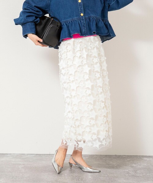 ◇26SS◇ Rie Miller ◆Point ・45周年を記念し、ブランドお馴染みの「星柄レース」をス贅沢に使った、特別なスターフリンジスカートが登場 ・ウエストには、パッと目を引く蛍光カラーのゴムを使用 ・タイトスカートながら、体に張り付くことのないゆったりしたサイズ感 ・深めの後スリットは、足さばきを考慮した長さに ・シンプルなTシャツやシャツと合わせるだけで着映えるアイテム ・パンツやスカートととのレイヤードスタイルを楽しめる一枚 ・同素材キャミワンピース(6-0037-2-07-008)あり ・裏無し ●お取扱い上のご注意● 末永くご愛用頂くために、アテンションタグを必ずご確認の上、着用又はお取り扱い下さい。 気になる商品は、お気に入り登録がオススメです! クーポン情報、入荷情報が、通知されるようになります。 ※手洗い可 ※店頭及び屋外での撮影画像は、光の当たり具合で色味が違って見える場合があります。商品の色味は、スタジオ撮影の画像をご参照下さい。 ※商品画像に関しては出来る限り忠実に表示出来るよう努めておりますが、お客様がご利用のモニターの設定及び特性により、実際の商品と比較し色味に若干の誤差が生じる場合があります。 ※画像の商品はサンプルとなりますので実際の商品と仕様、加工、サイズが若干異なる場合がございます。