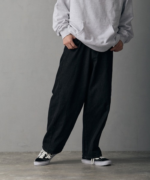 程よい厚みのデニム生地を使用した、バレルレッグジーンズです。 裾にかけて丸みを帯びたようなバルーンのようなカーブシルエットが最大の特徴。 ●樽(バレル)のような丸みのあるカーブが、いつものワイドデニムとは一線を画す新鮮な印象に ●ウエスト周りのタックなど、きれいめに見えすぎないよう、カジュアルでルーズな雰囲気を演出 ●ごわつきすぎない履きやすさと、デニムらしいしっかり感を両立 ●淡いサックス、クールなネイビーやウォッシュドブラックなど5色展開 ワイドパンツ、バギーパンツ、バルーンパンツ、ストリート、Y2Kといったトレンドワードを網羅! ビッグシルエットで、男性はもちろん、女性もルーズに着こなせるサイズ感。 古着MIXや韓国ファッションにもマッチします。