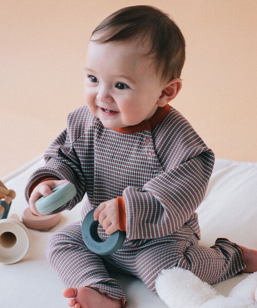 初めてのセパレートに♪首元と袖口のカラーがアクセントになり、シンプルながらもコーディネートの主役になるベビー用トップスです。ボーダー2色と無地のSAGEカラーのバリエーションをご用意。動きがより活発になる時期のお子様に寄り添う動きやすいデザイン。袖口はリブ仕様で、お子様の腕に優しくフィットします。首元にはスナップボタンが付いており、着脱が楽ちんなのが嬉しいポイント!裾部分には可愛らしいブランドロゴのタグがあしらわれています。■ケア方法水洗い可(詳細は商品についている品質表示ラベルをご覧ください)生地の厚さ:普通伸縮性:あり裏地:なし【対象年齢:およそ3ヶ月~2歳】SMOKE BROWN:Model:H71(cm)Size:60-70LIGHT YELLOW・SAGE:Model:H71(cm)Size:60-70SAGE:Model:H70(cm)Size:60-70※デリケートな赤ちゃんのお肌を守るために、着用前の水通しをおすすめいたします。※光の当たり具合やパソコンなどの閲覧環境によって実際の色味と異なって見える場合がございます。予めご了承ください。※商品の色味は商品単体で撮影した画像をご参照ください。こども ビームス / コドモ ビームスこどもたちの豊かな感性や想像力を、よりいっそう伸ばすきっかけになるモノやコトを提案する〈こども ビームス〉。日々成長するこどもとのかけがえのない時間が心豊かで、もっと素晴らしいものになるようなモノやコトを提案しています。