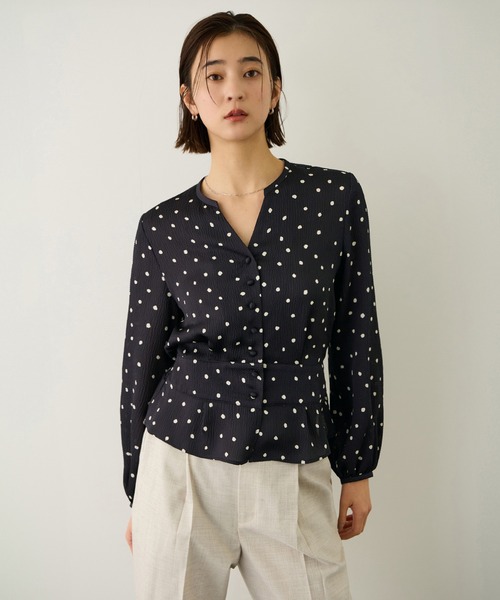 ひと足早く春を感じる、繊細かつ生地の光沢が美しいクラシカルなフェミニンブラウス【デザイン・シルエット】 お仕事からカジュアルシーンまで、1枚でサマになるデザインブラウス。 後ろウエストにシャーリングを施し、程よくメリハリのあるタック入りペプラムシルエットがフェミニンな印象です。 表面感のある素材にドットプリントをあしらい、クラシカルな雰囲気に仕上げています。 【おすすめのスタイリング】 タイトスカートと合わせてきれいめ、デニムパンツと合わせて程よくカジュアルダウンなど、幅広いコーディネートに対応できる一着です。 【素材】 凹凸のあるクレーターサテン素材。ドットプリントで上品かつ華やかな印象です。 ---------------------------- 透け感:ベージュ(27)は少しあり 裏地:なし 伸縮性:なし 光沢感:ややあり 生地の厚さ:薄手 ポケット:なし 開き方:かぶり/ボタン 洗濯:手洗い可能 --------------------------- 【モデル情報】 モデル身長:171cm 着用サイズ:38 【ドットプリントシリーズ】 同素材/同柄でデザイン違いの ドットプリントペプラムブラウス(品番: GGH26200) ドットプリントウエストベルトワンピース(品番: GGE26010) がございます。 ※画像の商品はサンプルです。実際の商品と仕様、加工、サイズが異なる場合がございます。 ※撮影場所やライティング、お使いのモニター環境によって色の見え方が異なる場合がございます。 ※商品のカラーは画像の色味をご参照ください。動画は仕様説明のため、色味が実物と異なる場合がございます。