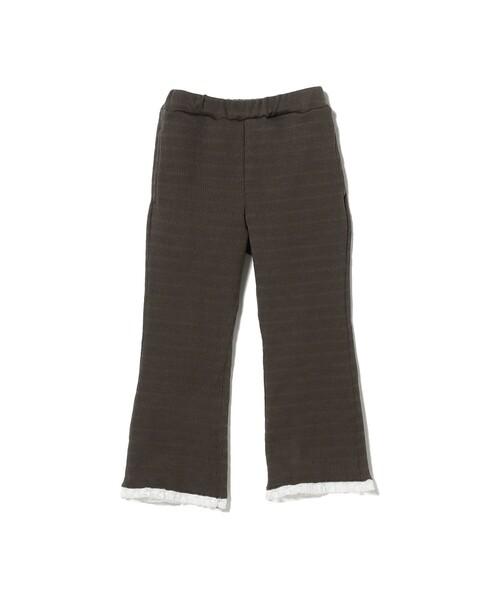歩くたび可愛さ弾むレースパンツ表面感のある変形フライス生地を使用した、ニュアンスたっぷりのフレアパンツです。柔らかな肌触りで動きやすく、毎日の通園・通学にもぴったりな1枚です。膝下から広がるフレアシルエットと、裾にあしらわれた繊細なレースが、歩くたびに足元を華やかに演出。1枚で主役にするのはもちろん、ワンピースの下にレギンス感覚で重ねるレイヤードスタイルもおすすめです♪春夏のコーデがもっと楽しくなる、着回し力抜群のアイテムです。■ケア方法水洗い・ドライクリーニング両方可(詳細は商品についている品質表示ラベルをご覧ください)生地の厚さ:普通伸縮性:あり裏地:なし【対象年齢:およそ2~10歳】Girl Model:H107(cm)Size:110※光の当たり具合やパソコンなどの閲覧環境によって実際の色味と異なって見える場合がございます。予めご了承ください。※商品の色味は商品単体で撮影した画像をご参照ください。こども ビームス / コドモ ビームスこどもたちの豊かな感性や想像力を、よりいっそう伸ばすきっかけになるモノやコトを提案する〈こども ビームス〉。日々成長するこどもとのかけがえのない時間が心豊かで、もっと素晴らしいものになるようなモノやコトを提案しています。