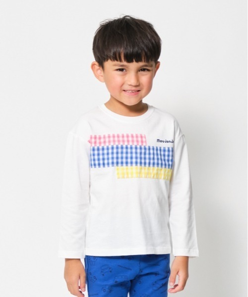 Tシャツに布帛のギンガムチェック柄の配色デザイン。毎シーズン人気の配色切替の長袖Tシャツ、ロンT。同じギンガムチェックを使った切替デザインのワンピース(M26303)があるので、兄弟でお揃い、ペアコーデ、リンクコーデもおすすめ!おそろいアイテムはギフトやプレゼントにも人気です!