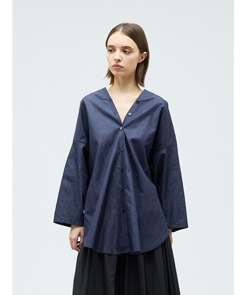 軽やかな4.5OZのデニム素材を使用したVネックデニムシャツです。程よい光沢もあり、上品な質感が特徴。首元のV開きが女性らしさを表現した上品な仕上がりになっています。脇にタックを入れ動きのあるデザインが印象的。鎖骨辺りから飾りボタンを付け、裾までボタン使いをしたフロントのデザインと、ふんわりと丸みのあるバックのデザインに仕上げており、前後で表情の違うシルエットはmizuiro indらしい1枚となっています。デニムのカジュアルな印象を感じさせないデニムシャツとなっています。同シリーズ1-250083/デニムワイドシャツワンピースも展開。Point袖丈:長袖デザイン:デニムネック:VネックDetail裏地:なし透け感:なし伸縮性:なし光沢感:多少ありポケット:なし※商品画像は、光の当たり具合やパソコンなどの閲覧環境により、実際の色味と異なって見える場合がございます。予めご了承ください。※商品の色味の目安は、商品単体の画像をご参照ください。こちらの商品 は mizuiro ind / MARcourt にてお取り扱いしております。店舗在庫等については直接店舗にお問い合わせください。