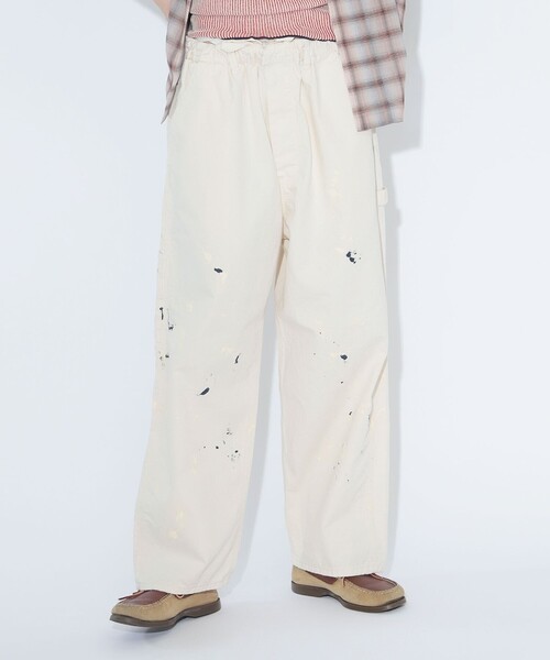 粗野な風合いを楽しむ、大人のカジュアルワーク ■デザイン ヴィンテージのオーバーオールから胸当てを大胆に取り除いたような、ユニークなリメイク風デザインが特徴。ワークウェアの無骨な雰囲気を残しつつ、現代的なイージーパンツ仕様へと昇華させた1着に仕上げています。 ■コーディネート シンプルなシャツやTシャツ、スウェットなど合わせるだけで「こなれ感」のあるスタイルが完成します。 ■ディテール 日本国内の職人が1点ずつ手作業でペンキを飛ばしており、手仕事ならではの贅沢でリアルなヴィンテージ感を再現。ウエストは紐で調節可能なイージー仕様になっており、本格的なワークウェアのディテールと快適な穿き心地を両立しています。 ■サイズ ゆとりを持たせたリラックス感のあるワイドシルエットです。 ■素材 1930年代以前から使用されているワークウェアの雰囲気を再現した、8.5オンスの「WHITE TWILL」を採用。綿花の葉や茎などが生地表面に残った「綿カス残し」の仕上げにより、粗野でナチュラルな表情を楽しめるのが魅力です。 ■ケア方法 洗濯可(詳細は商品についている品質表示ラベルをご覧ください) Model : H170 B78 W59 H85 Size :ONE SIZE ※本製品は、1点1点ペイントの入り具合がわずかに異なります。予めご了承ください。 ※アイテムサイズは商品サンプルを採寸しているため、実際の商品と多少の誤差が生じる場合がございます。 ※画像の商品はサンプルのため、実際の商品と「仕様」「色合い」が異なる場合がございます。
