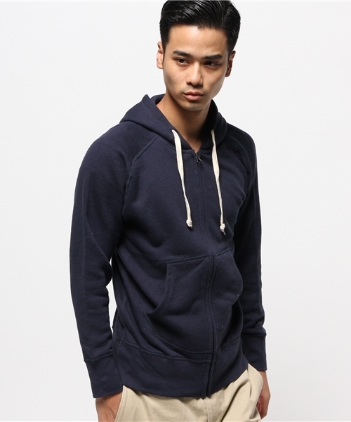 トンプキン裏毛とは“1時間に1m”という速さの旧式の吊り編み機で編まれた大変貴重な裏毛です。現在の編み機が“1時間に10m”という速さで“上から下へ”編みたてられるのに比べて、トンプキン裏毛は“下から上へ”と非常にゆっくり編み立てられ、その重力に反した手間のかかる編み方が品質の良さを物語っています。そのこだわり通り、柔らかく肌触りも良く着心地も抜群です。シンプルな無地の長袖ZIPパーカー。どんなコーディネートにも合わせやすい一着に仕上がっています。