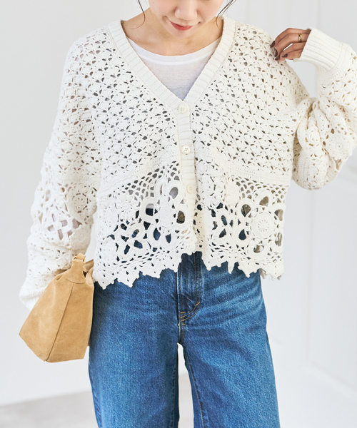 着こなしに表情を添える、クロッシェカーディガン。ナチュラルなコットン糸を使用し、かぎ針編みで仕上げました。複数のモチーフを組み合わせた立体感のある編み地が、シンプルなスタイリングに奥行きをプラスします。前立てと袖口には機械編みのリブをドッキングし、甘さを抑えたすっきりとした印象に。程よくバランスの取れたデザインで、デイリーに取り入れやすい一枚です。軽やかな着丈は春のコーディネートのアクセントにぴったり。羽織るだけで、季節感のある洗練スタイルが完成します。※取り扱いについては、商品についている品質表示でご確認ください。※こちらの商品は、Spick & Spanでの取り扱いになります。 直接店舗へお問い合わせの際は Spick & Span店舗へお願いいたします。※照明の関係により、実際よりも色味が違って見える場合があります。またパソコン・スマートフォンなどの環境により、若干製品と画像のカラーが異なる場合もございます。※商品の色味は、商品アップ画像をご参照ください。本体:ドライクリーニング