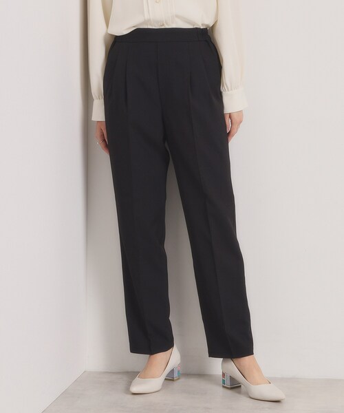 【デザイン】通勤・セットアップ対応ベーシックで着まわしやすいテーパードパンツ★嬉しい機能素材★1イージーケア2マシンウォッシャブルセンタープレスデザインがすっきり見えのテーパードパンツ。ウエストはゴム仕様で着脱しやすく、サイズカバー力も◎ヒップ部分にはフェイクのポケットを付けることで着になるお尻周りをカバーできる様にしています。【素材】ナチュラルストレッチの効いたツイル素材。【仕様】・ポケット数:横×2 フェイクポケット:後×2・裏地あり・ウエスト後ろゴム※照明の関係により、実際よりも色味が違って見える場合があります。また、パソコン・スマートフォンなどの環境により、若干製品と画像のカラーが異なる場合もございます。----------------------------------------★お気に入り登録がおすすめ★▽気になる商品はハートマークをクリック!・再入荷やセールの通知をお知らせ・お気に入り一覧からいつでもチェック▽ブランドのお気に入り登録も!・新商品やお得な情報をいち早くお知らせ----------------------------------------モデル情報:身長164cm B80 W60 H84 着用サイズ:38(M)店舗へのお問い合わせ商品番号:P93-65001●製品寸法:38(M):W64~72cm H88cm 股下66cm 前股上31cm 渡り幅29cm 裾幅17cm40(L):W66~74cm H90cm 股下67cm 前股上32cm 渡り幅30cm 裾幅18cm備考: