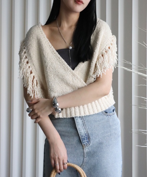 【テープヤーンフリンジカシュクールニットベスト】YENNA 2026 SS 新作袖のフリンジが可愛い!1枚プラスするだけで一気におしゃれに決まります!・深めのVネックとショート丈でバランがスよく見え、すっきりとした大人な印象に・袖元のフリンジが存在感抜群なので、一気に華やかになります・パンツに合わせればカジュアルスタイルに、スカートに合わせれば女性らしいコーデに・ワンピースと合わせても可愛い!着回し力も抜群です!------------------------透け感/なし光沢感/なし伸縮性/あり裏地/なし厚み/厚手------------------------※着用中の摩擦や、汗、水濡れにご注意ください。濃色品は、色落ちや他のものへ色移りすることがあります。※着用中や着脱の際、バッグやベルト、アクセサリーなどによる引っ掛けにご注意ください。【必ずご確認の上、ご検討ください】※商品画像は撮影時の光や角度、お使いのモニター環境により実物の色味と異なって見える場合がございます。※サイト上のカラー・サイズ表記と商品タグのカラー名・サイズ名が異なる場合がございます。※着用、お取り扱いの際は商品についておりますアテンションタグ、洗濯ネームを必ずご確認ください。※生産時期により、色・素材・サイズ感など多少異なる場合がございます。※商品によっては、繊維や染料のにおいが感じられる場合がございます。数日のご使用や陰干しなどで匂いはほとんど感じられなくなりますのでお試しください。※通販の特性上、到着時には畳みシワがついている場合がございます。【Information】◆《お気に入り登録》がオススメ◆・「商品のお気に入り登録」で再入荷通知や、ラストの通知、セール通知も受け取ることが出来ます。・「ブランドのお気に入り登録」で新商品や再入荷など、お得な情報を受け取ることが出来ます。※ご注文いただいた予約商品のお届け時期の確認は、注文履歴ページより行えます。公式InstagramやTikTok、WEARでは、スタイリングや新作アイテムの情報を公開中!ぜひチェックしてみてください!Instagram TikTok →【@yenna_ye_official】WEAR →【@yennastaff】
