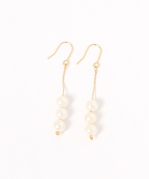 シンプルながら存在感抜群繊細なゴールドチェーンの先に3粒の人工パールをあしらったフックタイプのピアス。縦のラインが強調されるデザインなので、お顔周りをすっきりとシャープに見せてくれます。フック部分はステンレス仕様になっています。■原産国:日本ーーーピアス 日本製ーーー