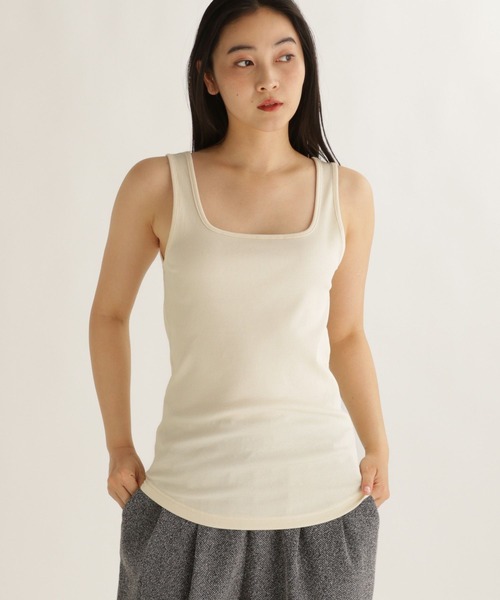ディテールにこだわったデイリー使いに最適な一着スタイリングにも馴染みやすいリブタンクトップーーー【素材】柔らかい風合いで着心地のいい素材を使用。滑らかな肌当たりでシーズンレスでご着用いただけます。【デザイン】ベーシックなアイテムだからこそディテールにこだわったリブタンクトップ。ラウンドしていないストレートなラインの胸元はシャツやVネックからバランスよく見えます。また、後ろのラウンドもやや深くすることで、バックが開いたデザインのトップスとの相性も抜群。裾は出して着用する際はサイドが上がっているので脚長効果があり、またインする際も腰回りのもたつきが少なく着やすいアイテムです。ーーー【スタイリング】シアー系のトップスのインナーとしてシルエットが出る時でもスクエアネック気味なのでバランスよく華奢見えします。春夏はシアー系のトップスやシャツのインナーとして、秋冬はニットやスウェットと合わせて裾だけ見せるスタイリングもおすすめです。